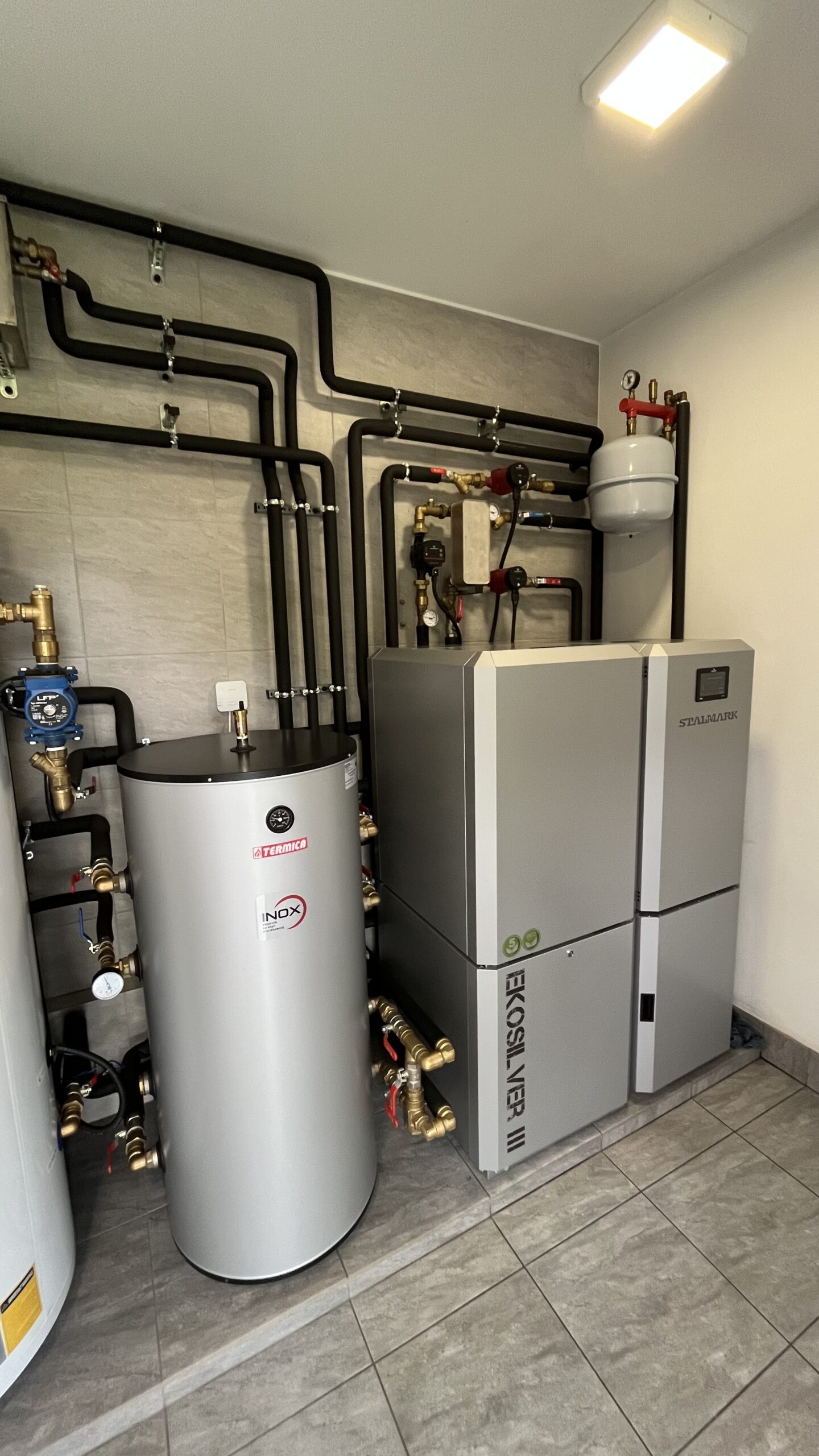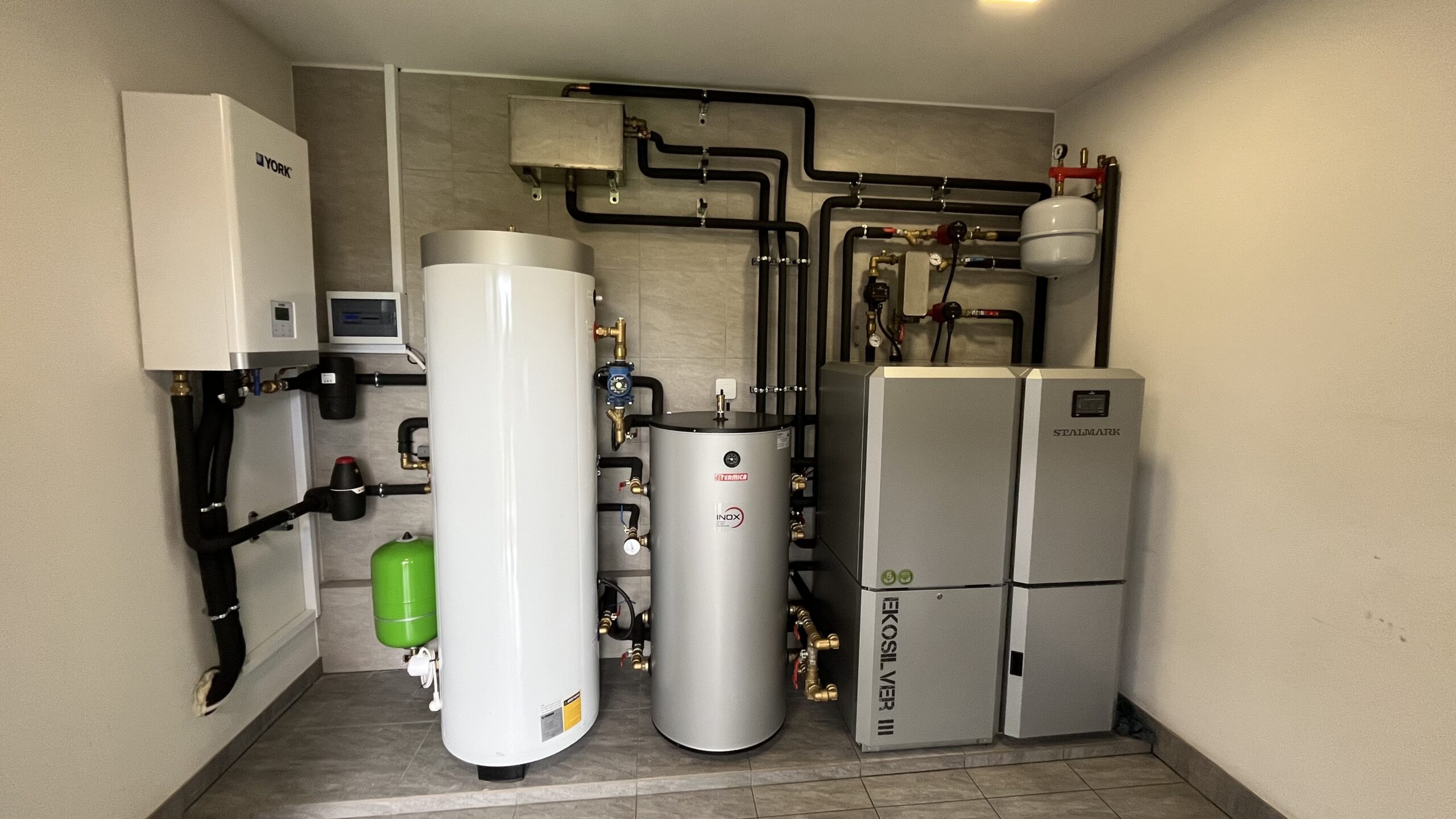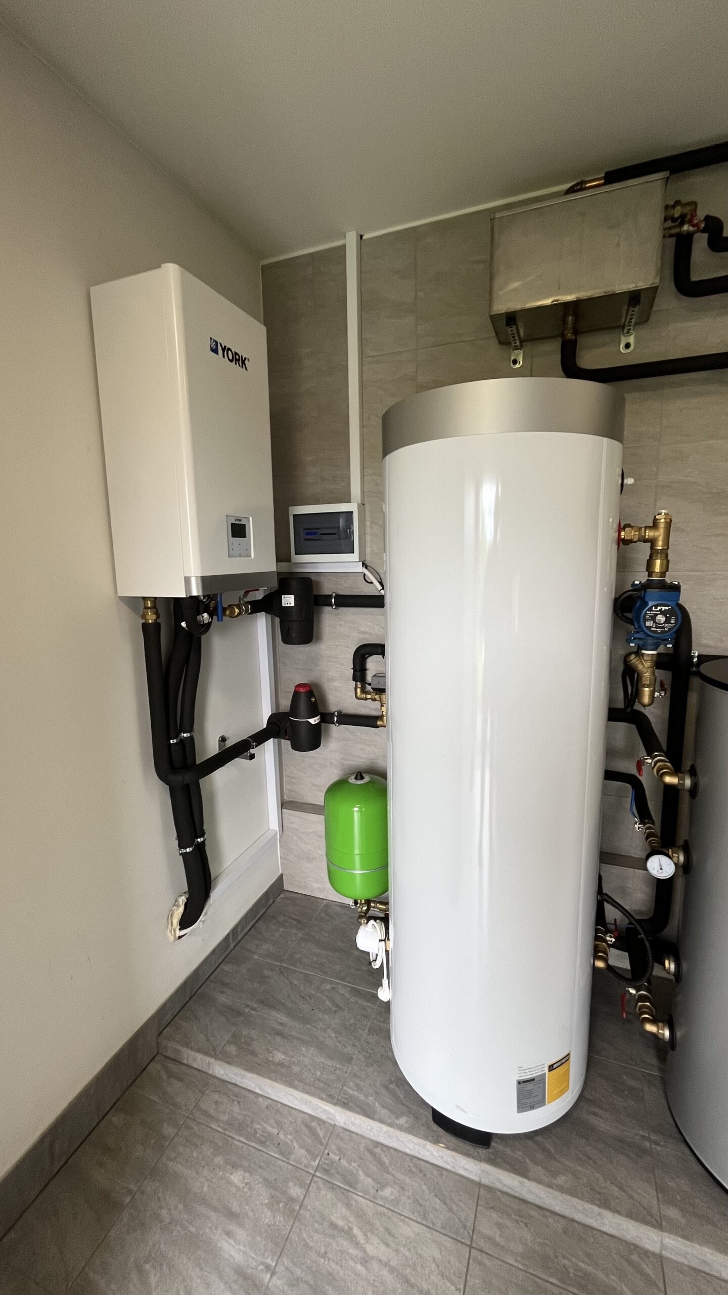 Do pracy na cele grzewcze dołożono pompę ciepła YORK® typu split YKF10ANB o mocy 10 kW, która ogrzewa instalację grzejnikową. Na instalacji grzewczej zamontowany jest zbiornik CWU 300 litrów oraz zbiornik buforowy 120 litrów.