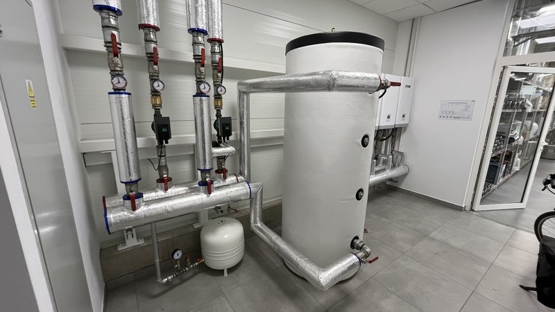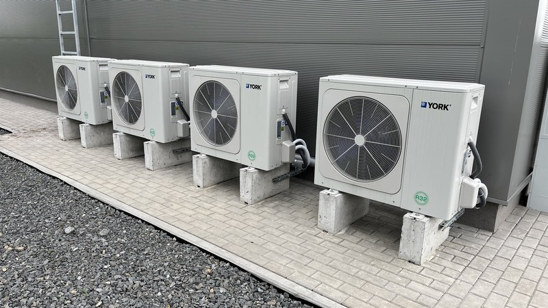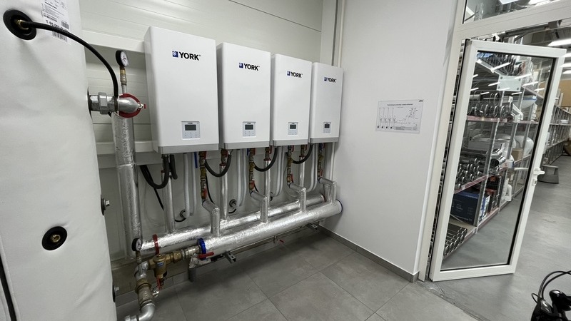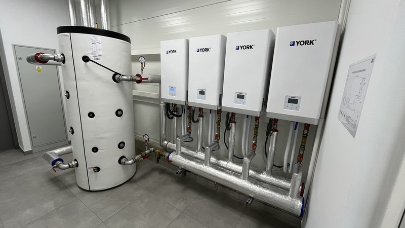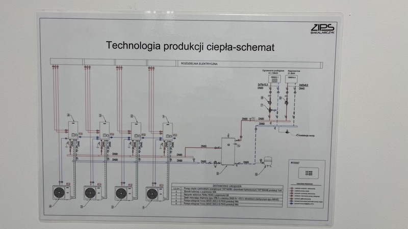 Do pracy na cele grzewcze zastosowano kaskadę 4 pomp ciepła typu split YKF14ARB o mocy nominalnej 14 kW każda. Pompy ciepła dostarczają czynnik grzewczy do bufora o pojemności 500 dm3, skąd jest on dostarczany do instalacji odbiorczej, na którą składa się instalacja podłogowa w części biurowej oraz nagrzewnice wodne w części sprzedażowo/magazynowej.