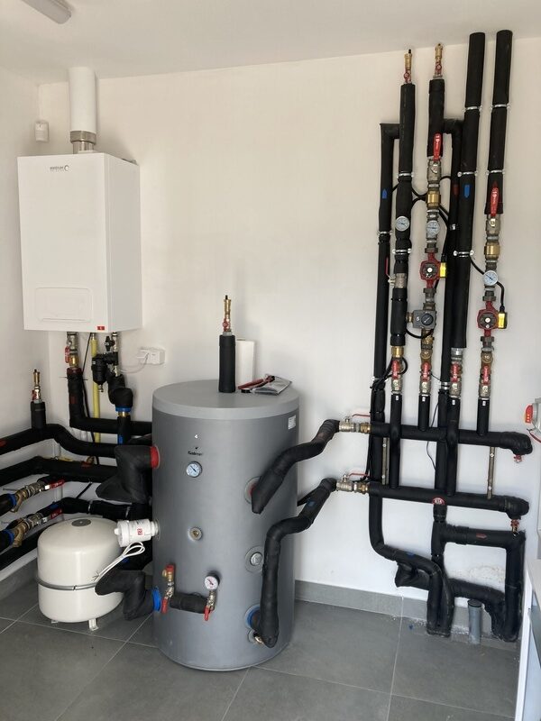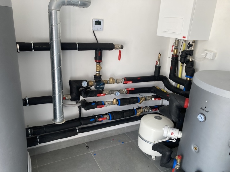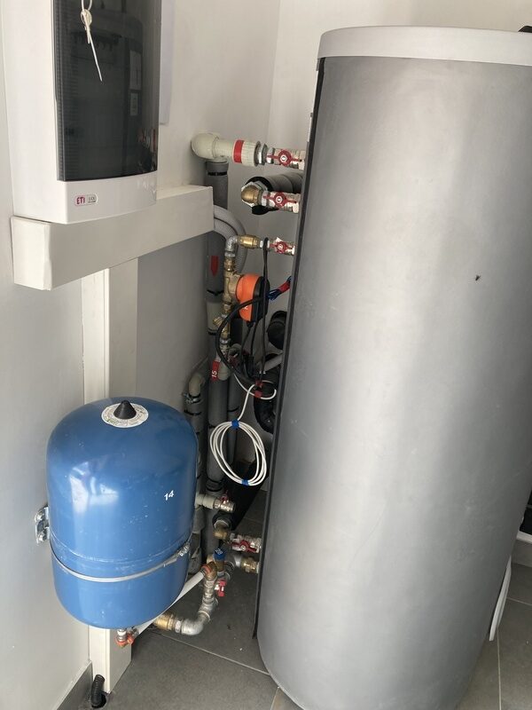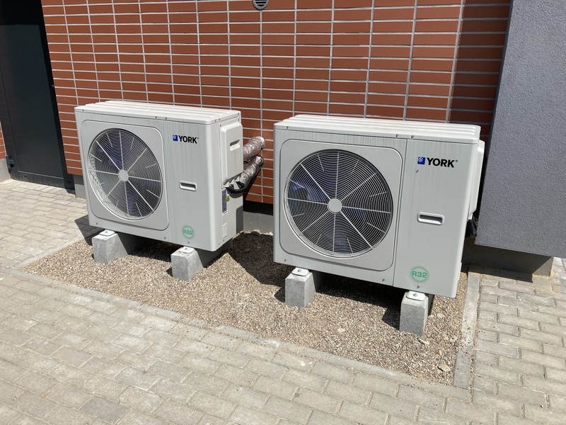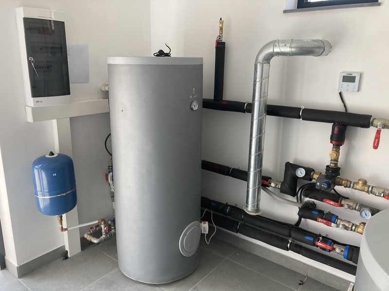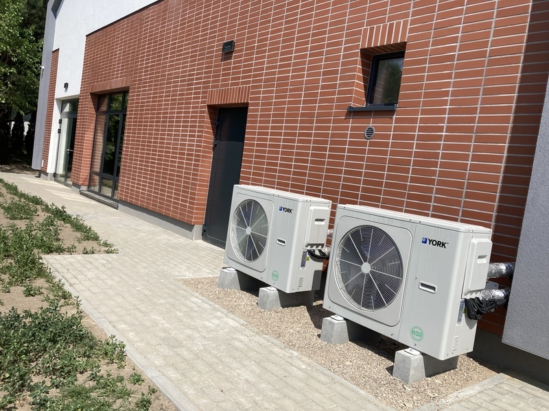 Do pracy na cele grzewcze zastosowano kaskadę pomp ciepła monoblok 2 x YKF14CRC wraz z kotłem gazowym kondensacyjnym o mocy 30 kW zastosowanym jako źródło szczytowe. Instalacja grzewcza składa się z grzejników oraz instalacji podłogowej. Wszystkie urządzenia grzewcze podłączone są do bufora o pojemności 200 dm3. C.w.u. realizowane jest poprzez pompę ciepła w zbiorniku o pojemności 500 dm3.