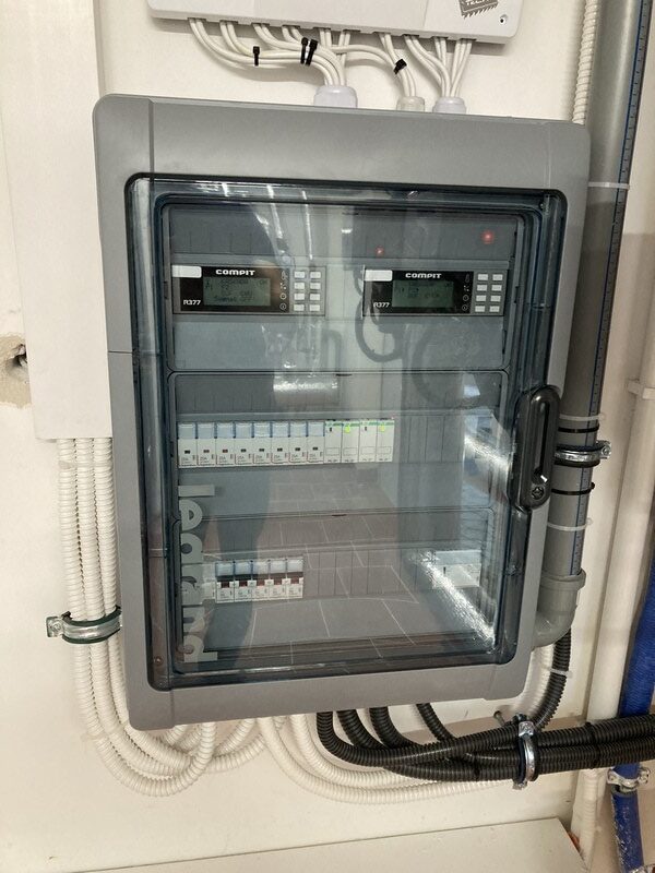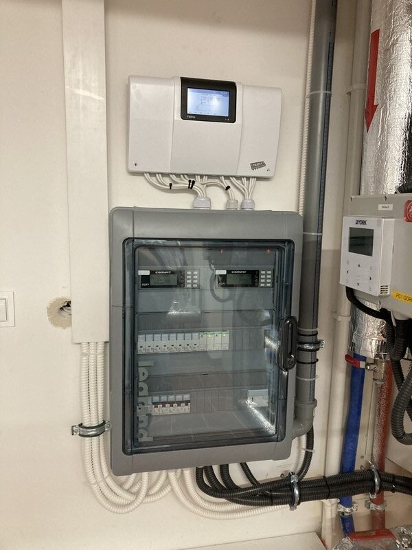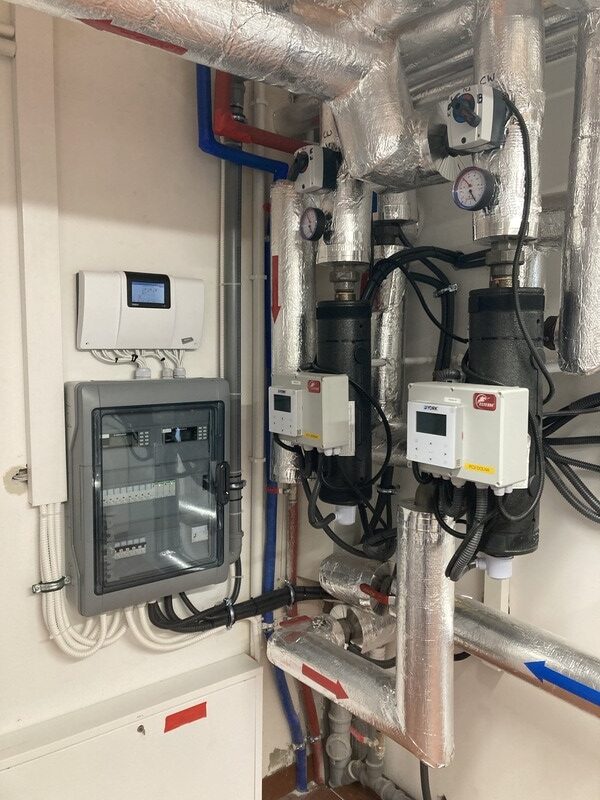 W budynku zaprojektowano kaskadę 2 pomp ciepła o mocy nominalnej 16 kW każda. Pompy ciepła zasilają obiegi grzewcze w postaci instalacji podłogowej oraz nagrzewnicy w centrali wentylacyjnej. Dodatkowo układ przystosowany jest do chłodzenia poprzez instalację klimakonwektorów, pompy ciepła podłączone zostały do bufora o pojemności 500 dm3 w izolacji z kauczuku. C.w.u. realizowane jest kaskadowo przez obie pompy ciepła w zbiorniku o pojemności 500 dm3. W przypadku dużego zapotrzebowania na grzanie lub chłód do utrzymania temperatury dyspozycyjnej w odbiornikach zastosowano elektryczne ogrzewacze przepływowe wody, zlokalizowane na wyjściu ze zbiornika c.w.u.